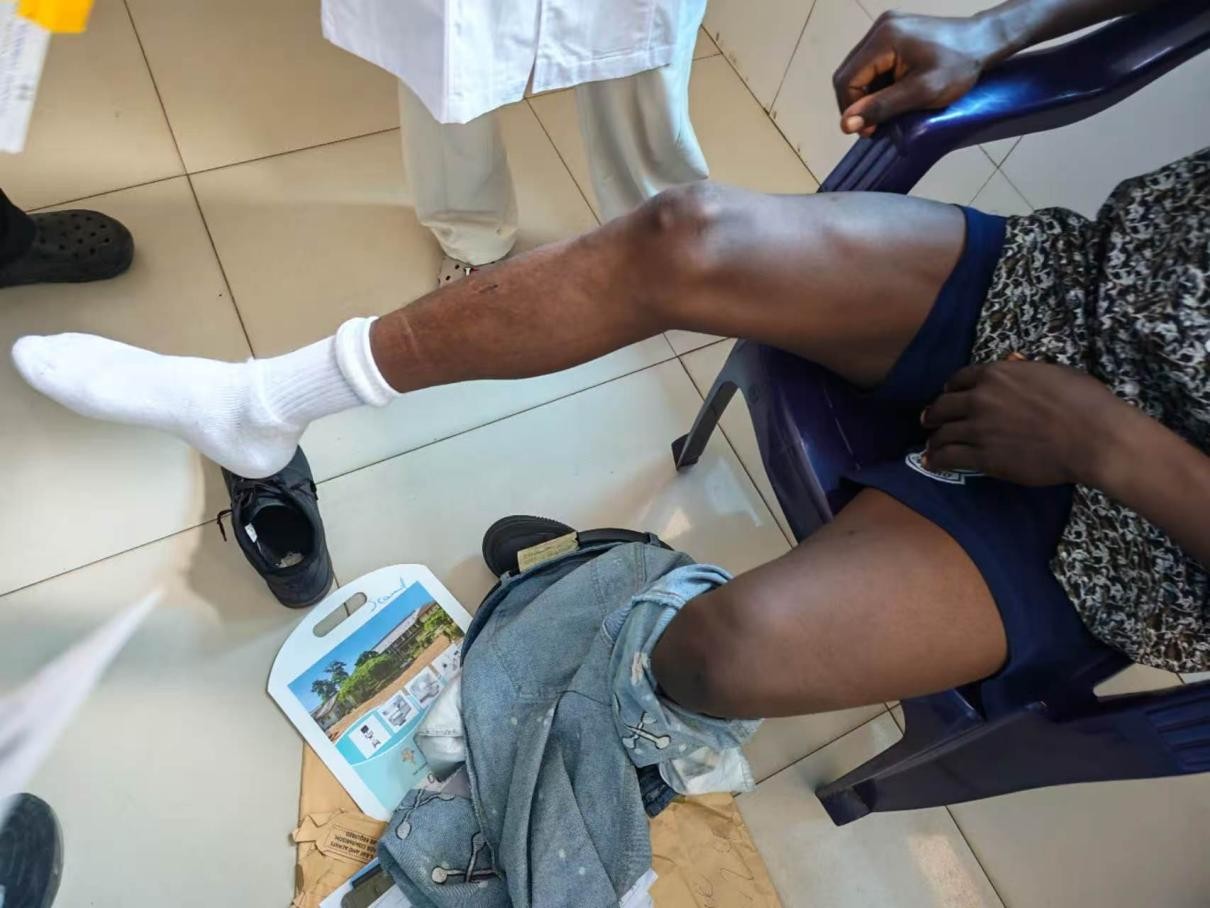 Relief finally came when he was admitted to the Sierra Leone-China Friendship Hospital, where the 27th Chinese Medical Team is stationed. Upon examination, doctors noted severe pathological swelling of the knee, immediately recognizing the urgency and complexity of the case.