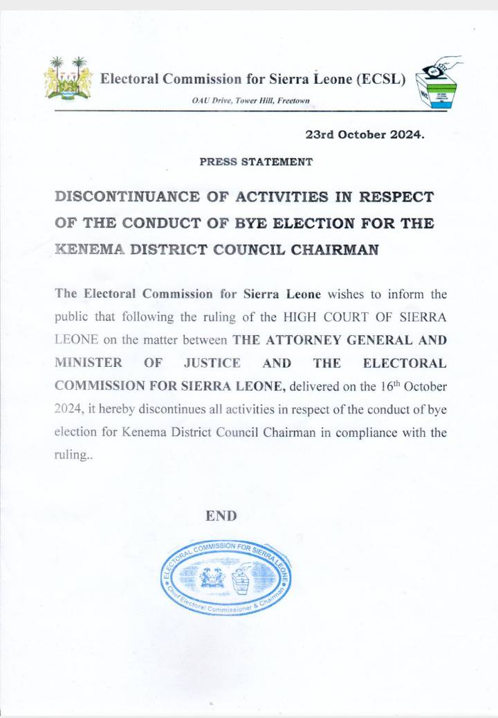The Electoral Commission for Sierra Leone (ECSL) has announced the discontinuation of the bye-election for the Kenema District Council Chairman, following a High Court ruling.