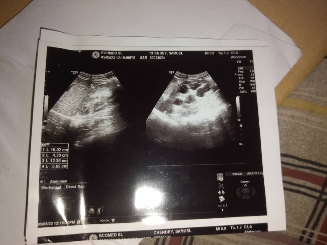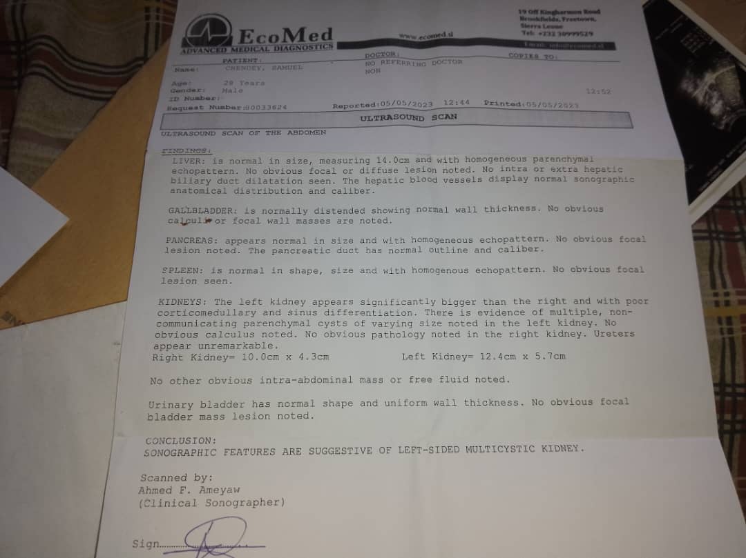 Chendey who is now in the second year of his course was diagnosed with kidney disease at the EcoMed Medical Center at Kingharman Road in Freetown. It was discovered in his scan result, that he has Kidney stones which one of the kidneys is bigger than the other.