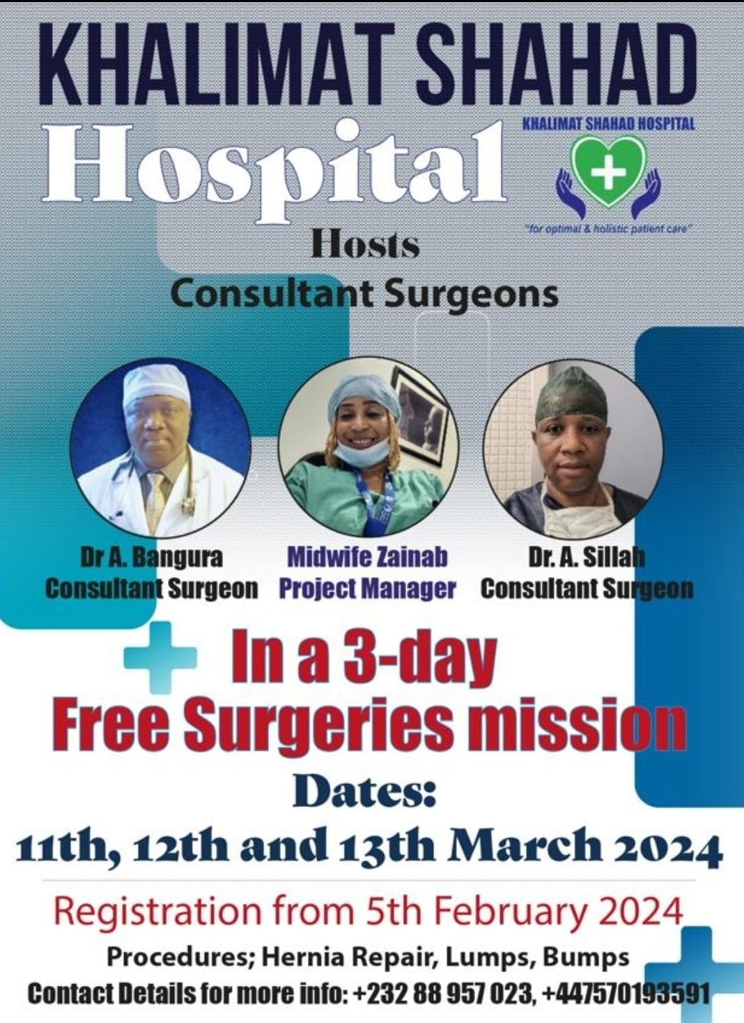 The Khalimat Shahad Hospital is set to host consultant Surgeons on a three days free surgeries mission that will seek to help Sierra Leoneans.