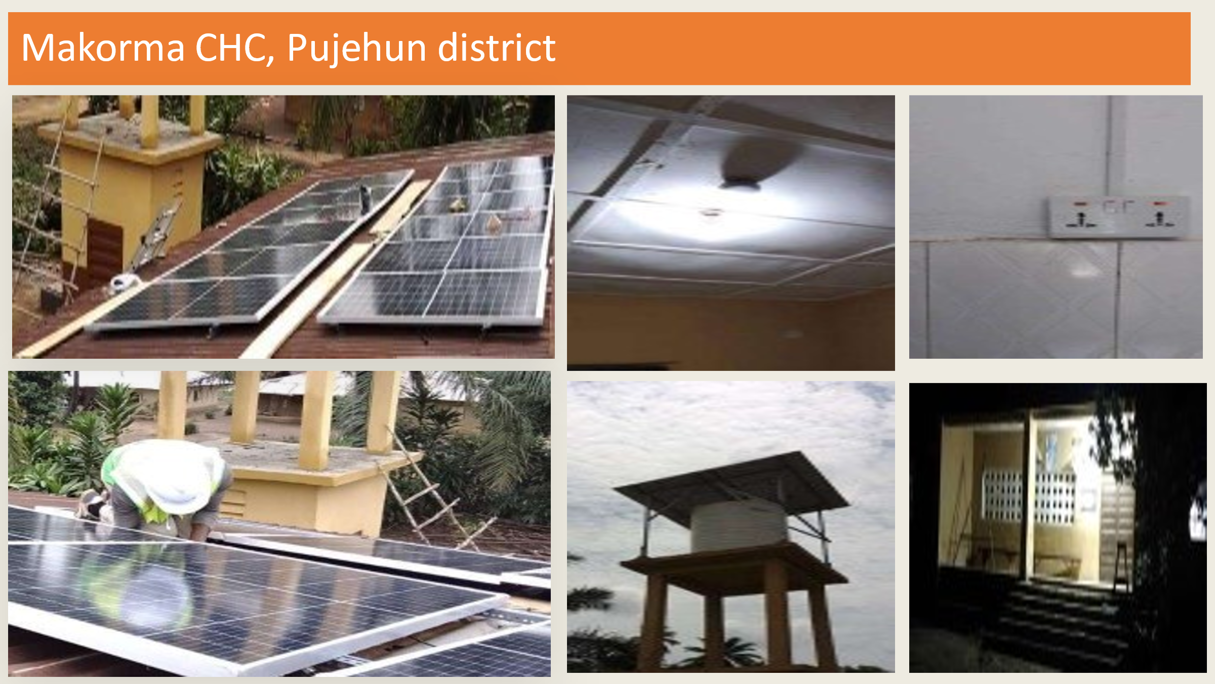 The main objective of this project is to Increase energy services available to twenty-six (26) off-grid health centers in Sierra Leone to improve healthcare delivery, increase utilization of Internet services in these off-grid health centers to improve information and data dissemination, and Pilot and test eight (8) water purification services in selected health centers to provide potable water for medical and community utilization.