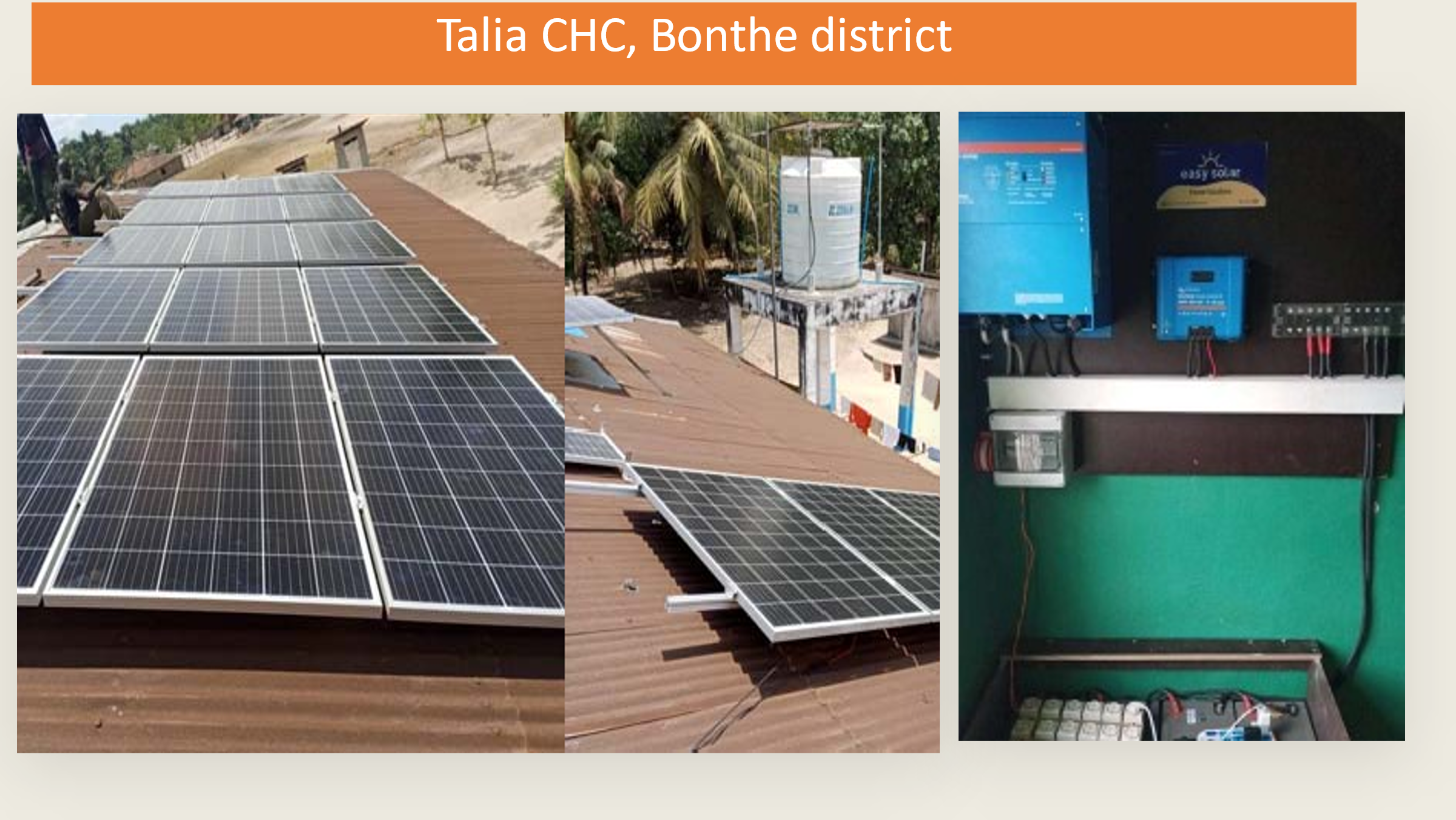 Orange Sierra Leone as implementing partner is supplying the technical ability for the installation of the PV systems and will also supply internet connectivity in all twenty-six community health centers. The energy systems will be based on solar/photovoltaic (“PV”) electricity generation equipment, which will be sized to meet the needs of each of the twenty-six health facilities (ranging from 5KWH to 10KWH).