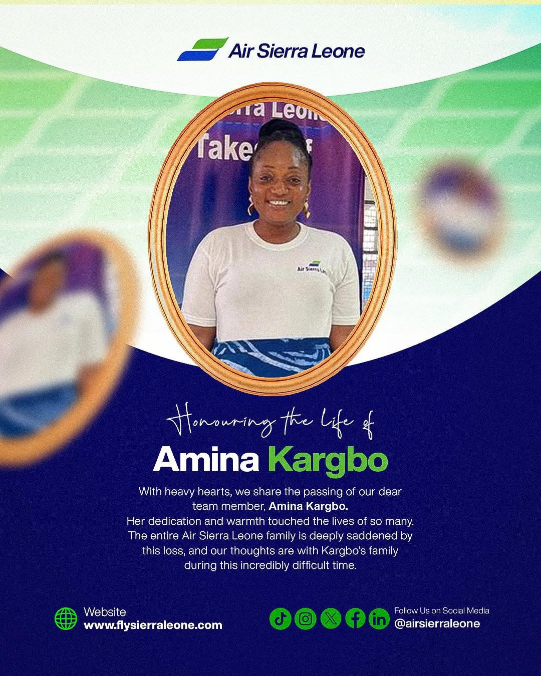 Air Sierra Leone has announced the death of its Human Resource Manager, Amina Kargbo, describing the loss as a deeply felt tragedy for the company.