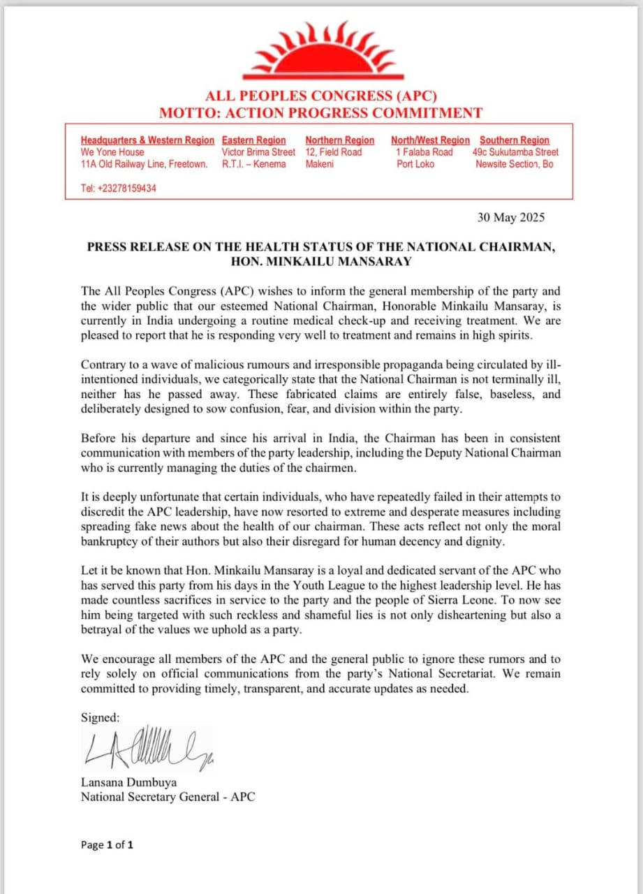 The All Peoples Congress (APC) has issued a statement to clarify the health status of its National Chairman, Honorable Minkailu Mansaray, who is currently in India for a routine medical check-up and treatment.