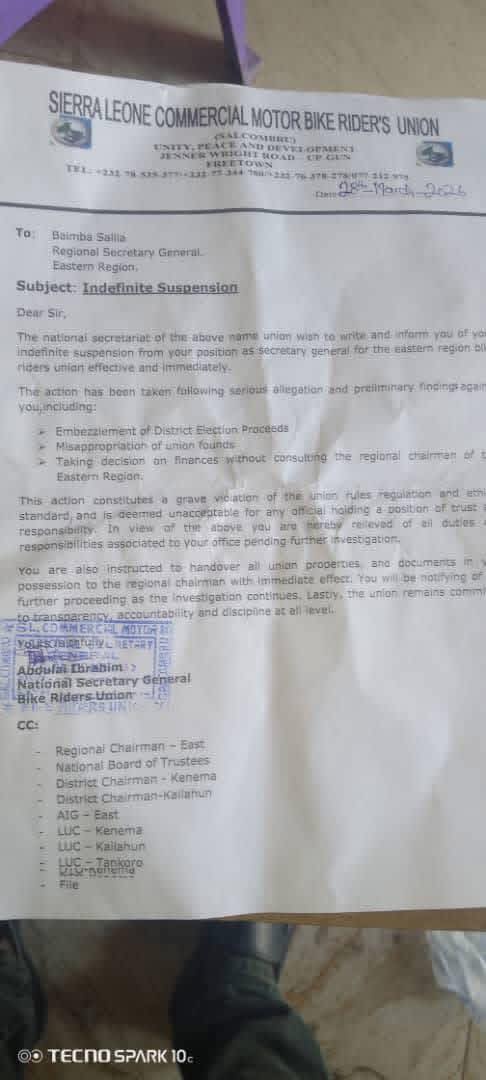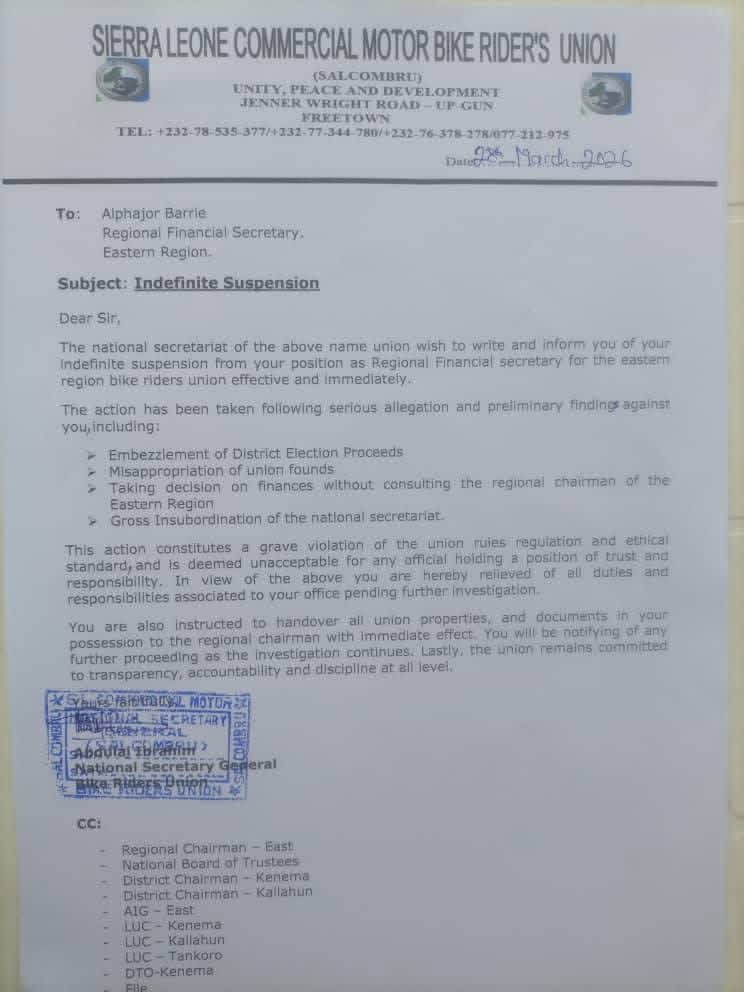 The Sierra Leone Commercial Motor Bike Riders Union has indefinitely suspended its Eastern Regional Financial Secretary, Alphajor Barrie, along with the Regional General Secretary East, over allegations of corruption and misconduct.