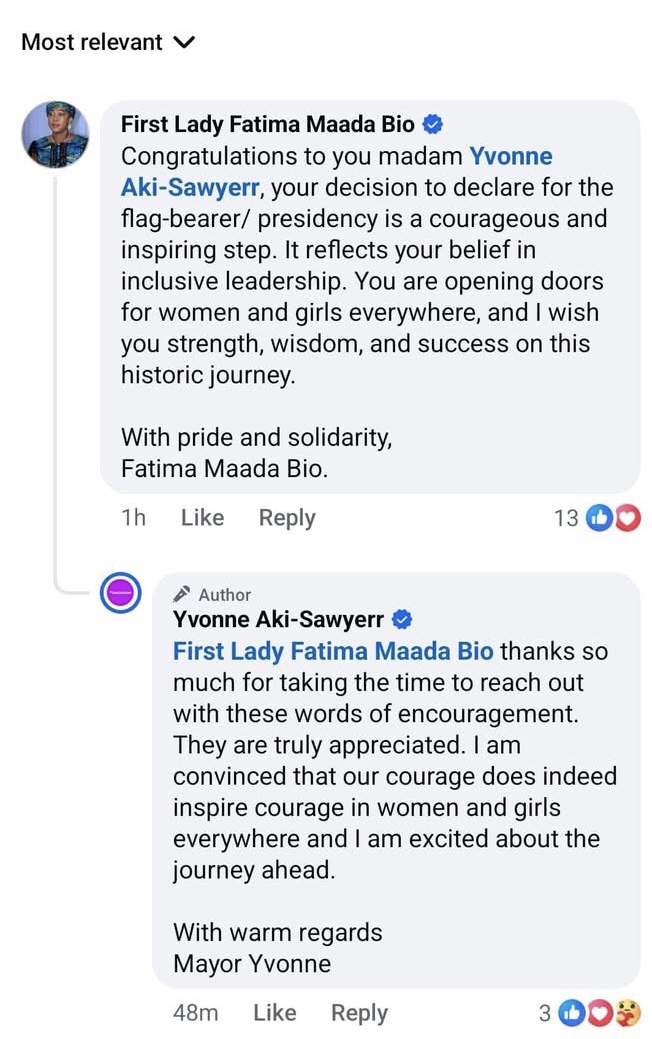 In her statement, Blyden claimed the First Lady’s action signalled a preference for Aki-Sawyerr over her within the APC, arguing that it reflected the ruling Sierra Leone People’s Party’s (SLPP) strategic interests rather than goodwill toward women in opposition politics. She stated that the endorsement made clear “which woman” the First Lady would prefer to face in a future presidential contest.