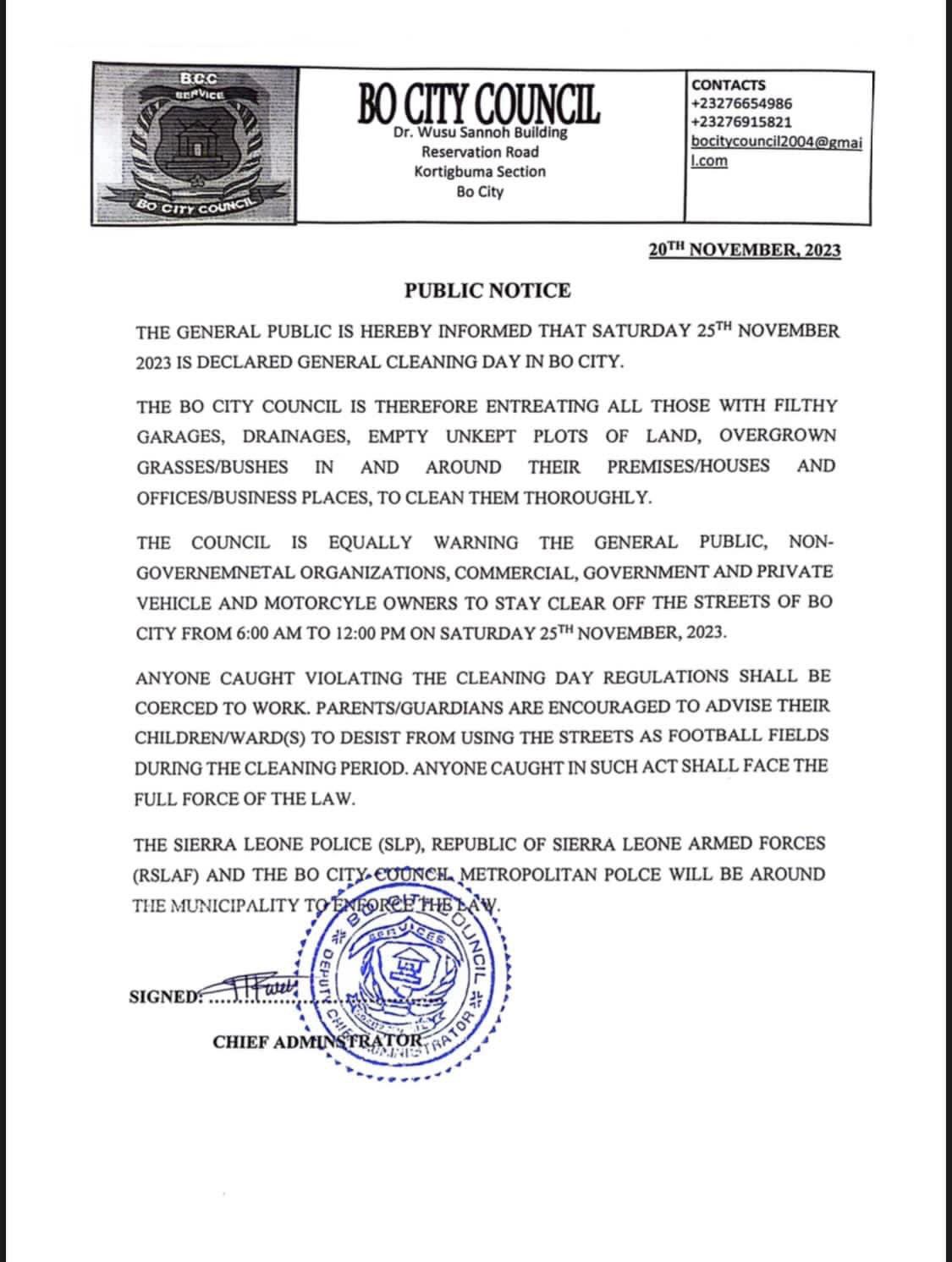 In a public notice released on November 20, 2023, the Bo City Council declared Saturday, November 25, 2023, as General Cleaning Day in Bo City. The announcement urges residents with untidy garages, neglected plots of land, overgrown grass/bushes, and clogged drainages to conduct thorough cleaning.