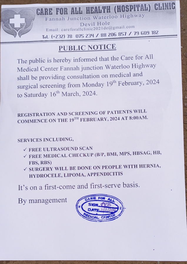 The Care For All Health (Hospital) Clinic located at Fannah junction, Waterloo Highway has informed the general public of providing consultation on medical and surgical screening.