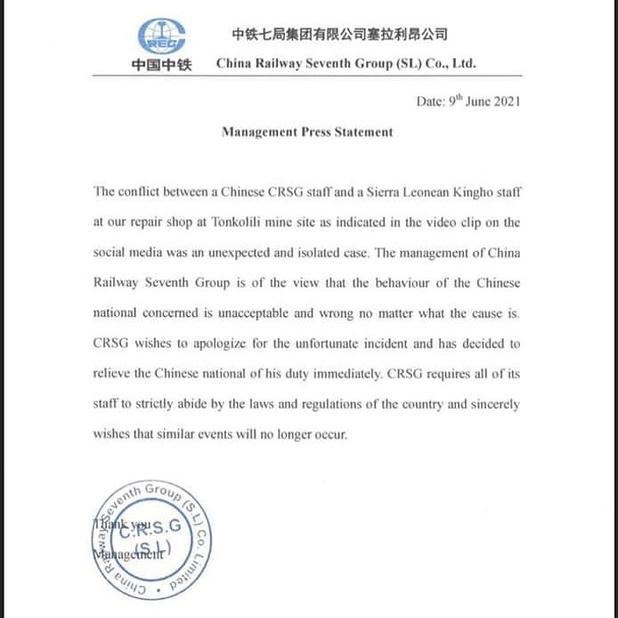 The China Railway Seventh Group (CRSG) has sacked a Chinese national who was captured on video fighting with a Sierra Leonean safety officer.