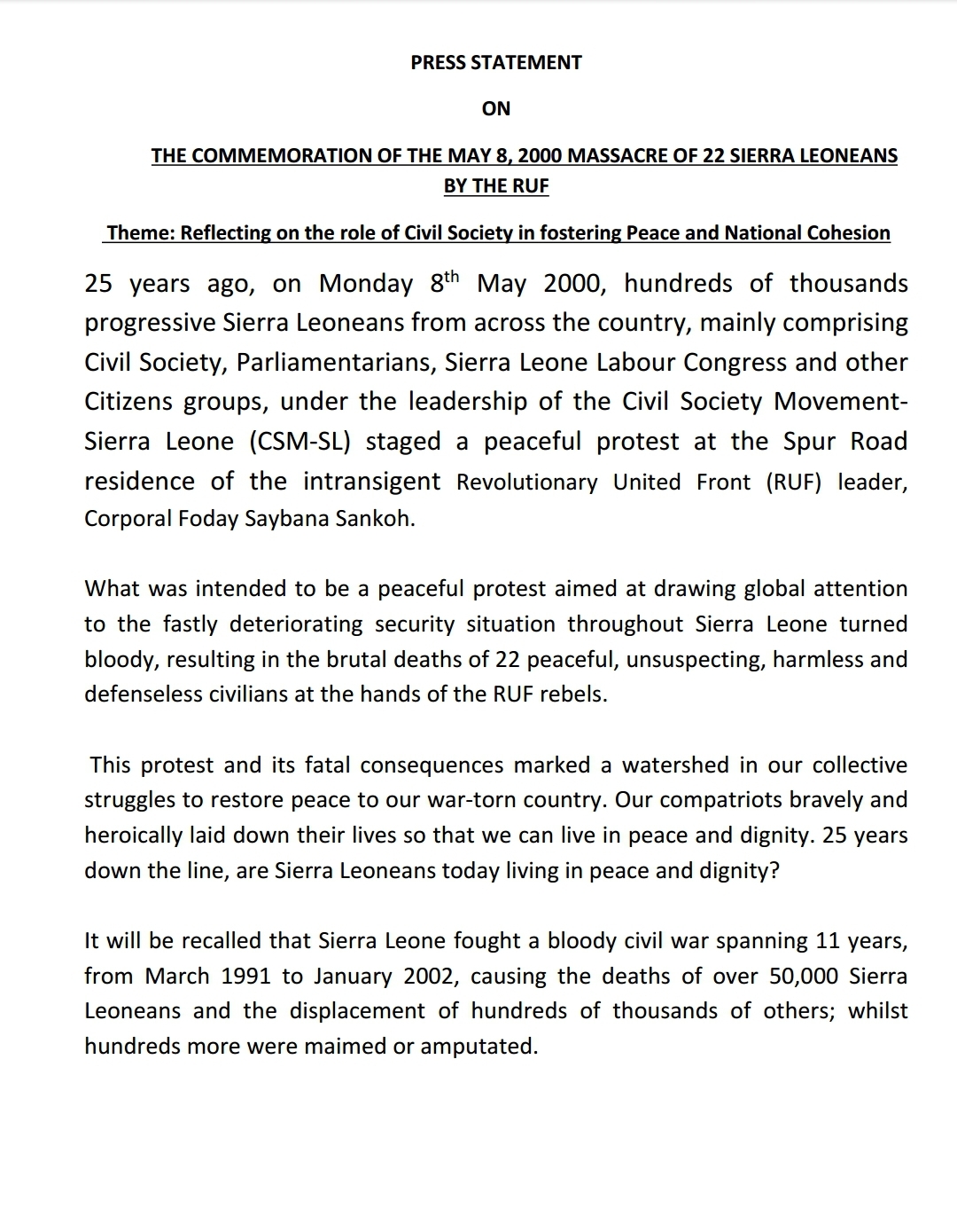 The Civil Society Movement-Sierra Leone (CSM-SL) on Thursday solemnly commemorated the 25th anniversary of the May 8, 2000 massacre, in which 22 unarmed civilians were brutally gunned down by Revolutionary United Front (RUF) rebels during a peaceful protest in Freetown.