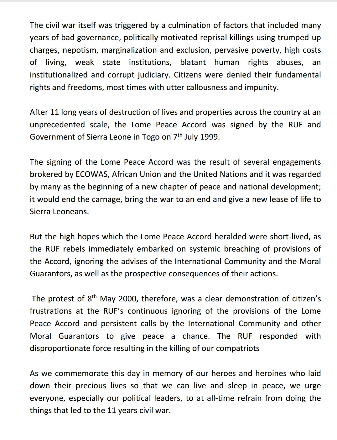 “What was intended to be a peaceful protest aimed at drawing global attention to the fast-deteriorating security situation throughout Sierra Leone turned bloody,” the statement reads, “resulting in the brutal deaths of 22 peaceful, unsuspecting, harmless, and defenseless civilians at the hands of the RUF rebels.”