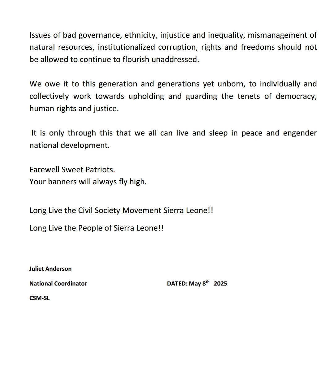“Farewell, sweet patriots. Your banners will always fly high. Long live the Civil Society Movement Sierra Leone. Long live the People of Sierra Leone.”