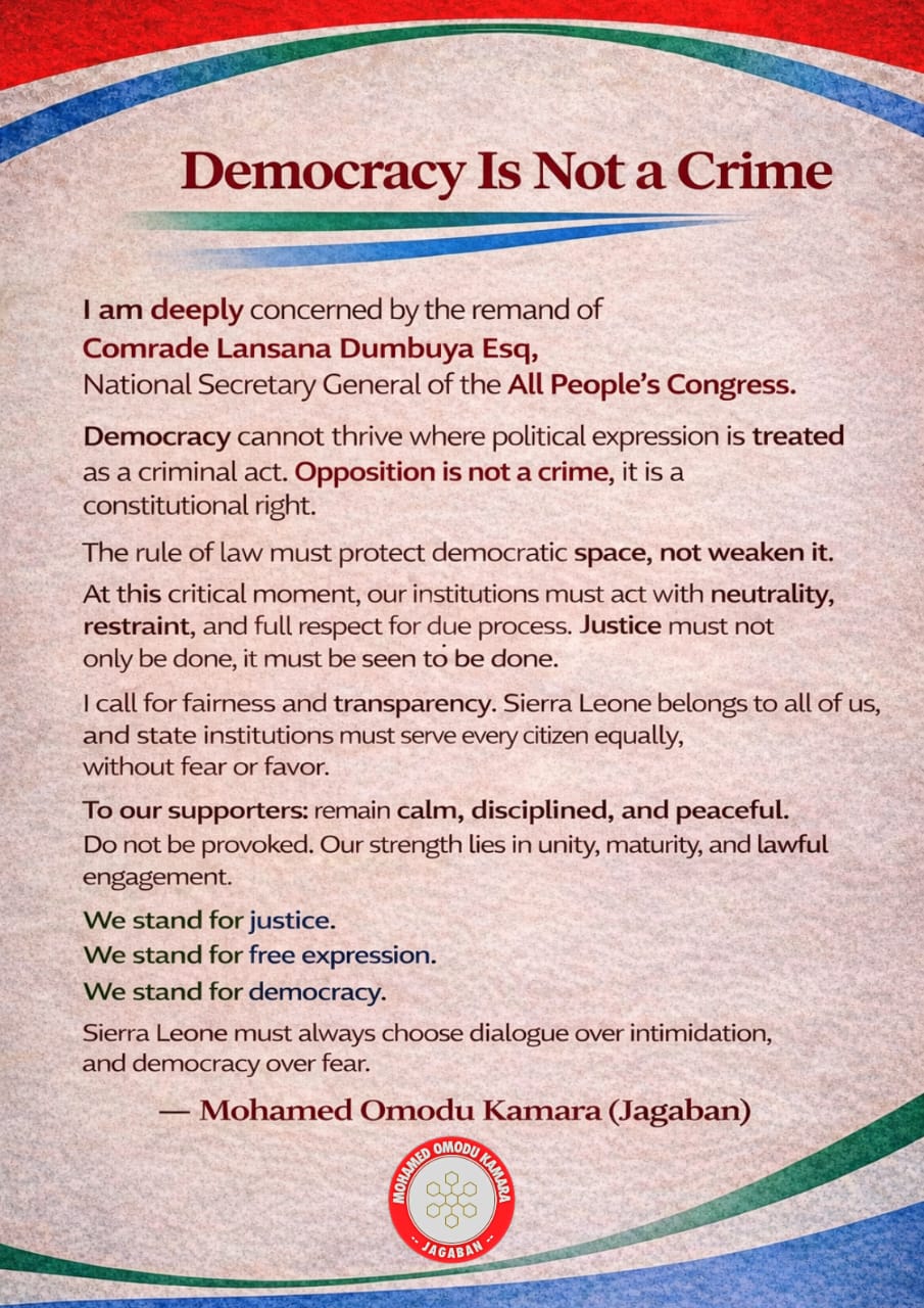 Kamara concluded by calling for dialogue over intimidation, saying the country must always choose democratic engagement over fear. His statement was signed in his name, Mohamed Omodu Kamara, popularly known as Jagaban, and issued in response to the remand of the APC National Secretary General.