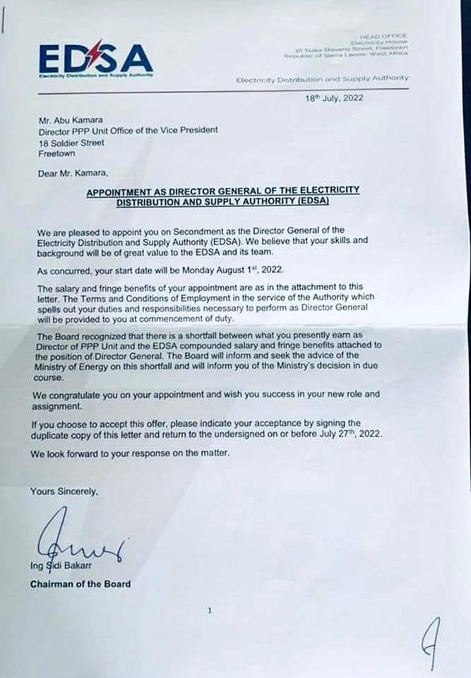 Sierra Leone’s Electricity Distribution and Supply Authority (EDSA) has written the Director of PPP Unit, Mr Abu Kamara, appointing him on secondment to serve as its Director General.