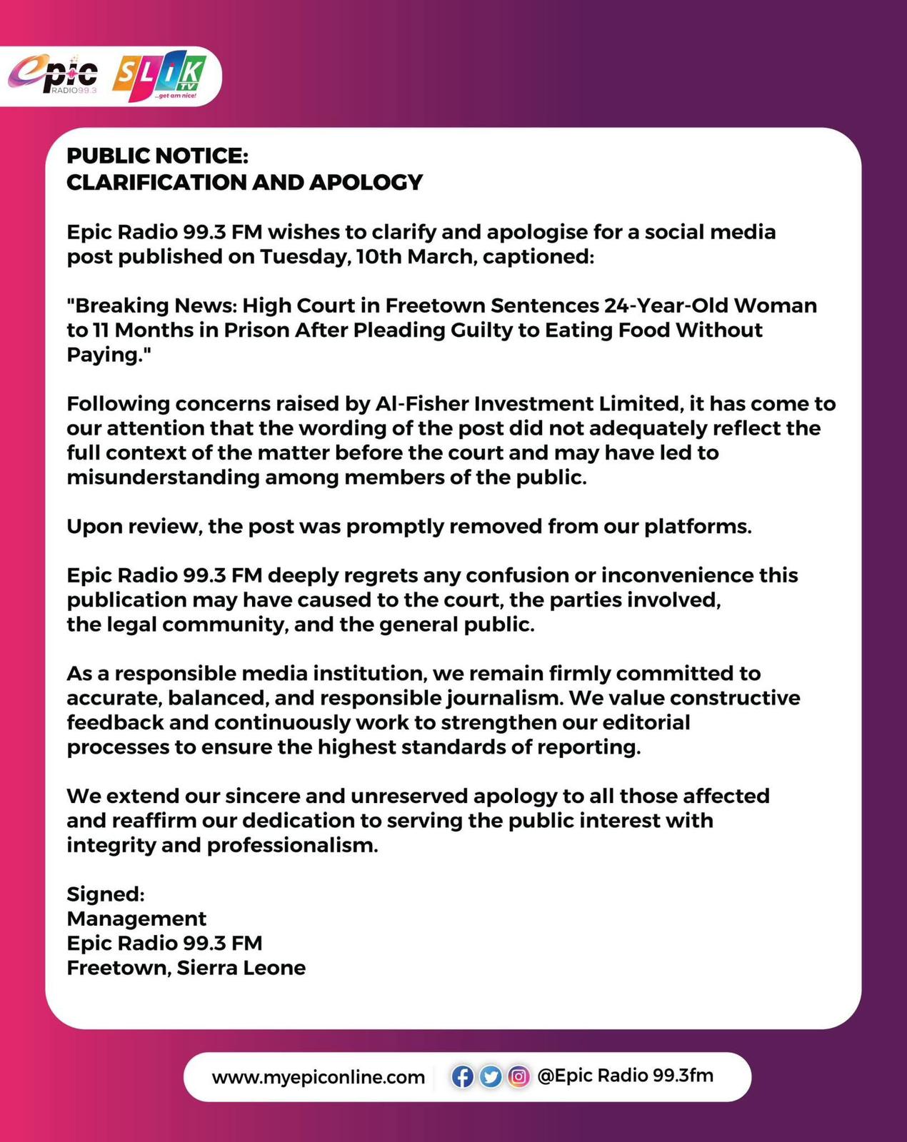 Epic Radio 99.3 FM has issued a public clarification and apology following a controversial social media post concerning a court ruling in Freetown.