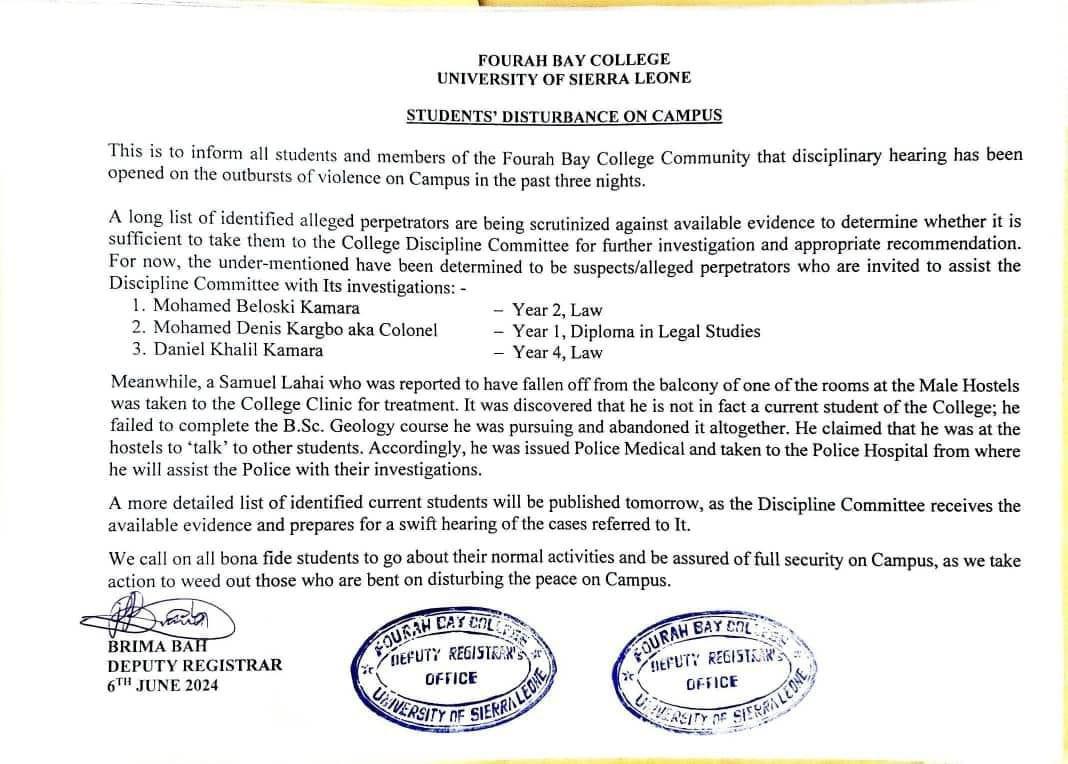Fourah Bay College, University of Sierra Leone, has issued a formal notice addressing the recent disturbances on its campus.