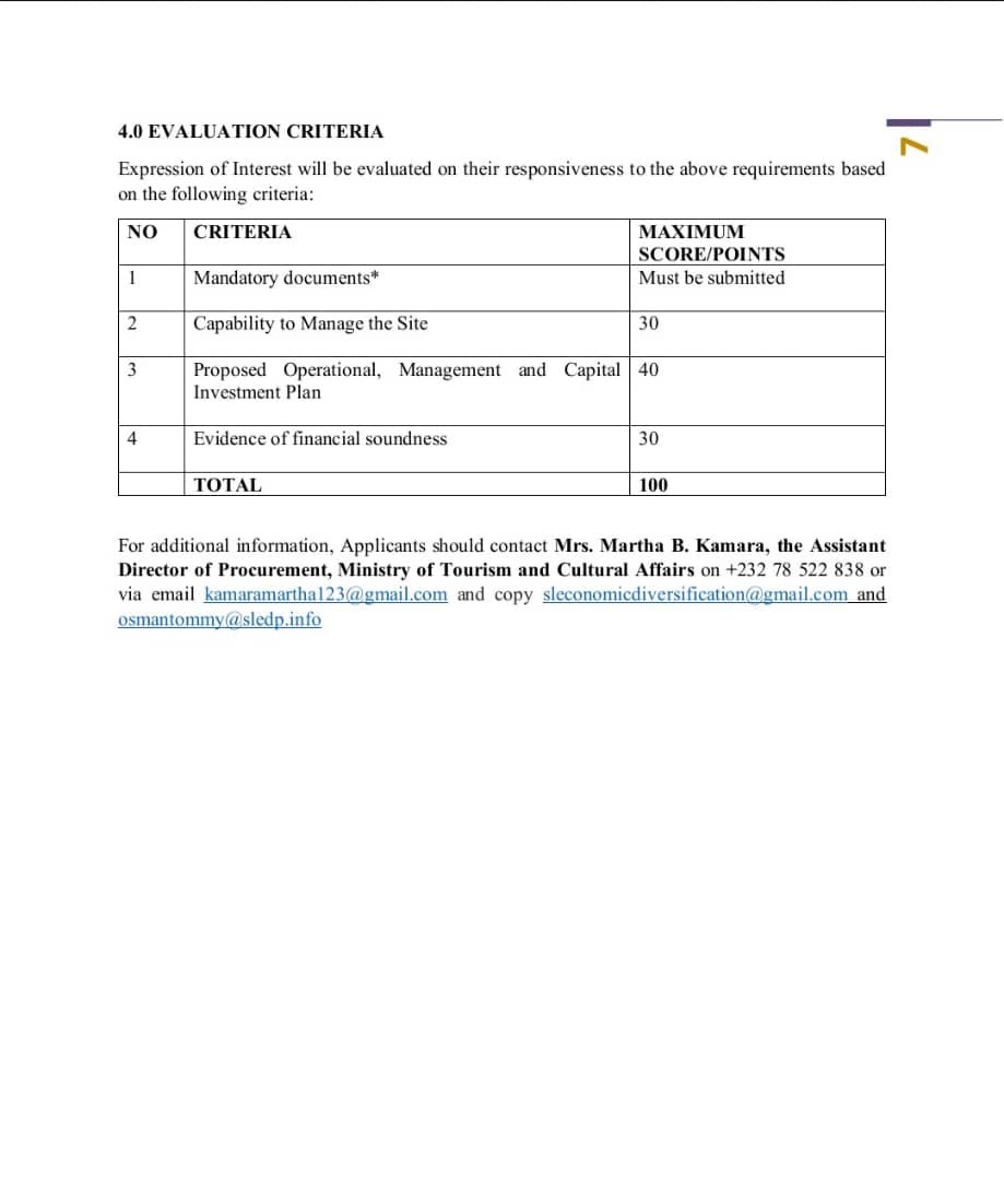 The Ministry of Tourism and Cultural Affairs of Sierra Leone has issued a formal call for Expressions of Interest (EOI) for the leasing and operation of the Viewing Platform and Ancillary Facilities/Services at Leicester Peak.