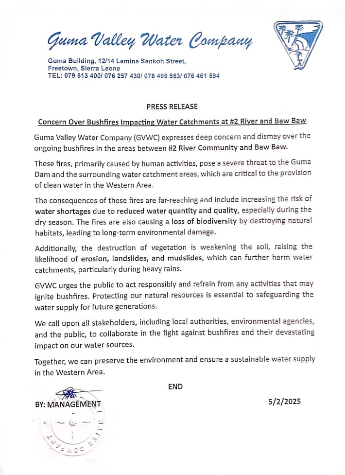 According to a press release dated 5th February 2025, these fires—primarily caused by human activities—pose a severe threat to the Guma Dam and surrounding water catchment areas, which are critical to providing clean water in the Western Area