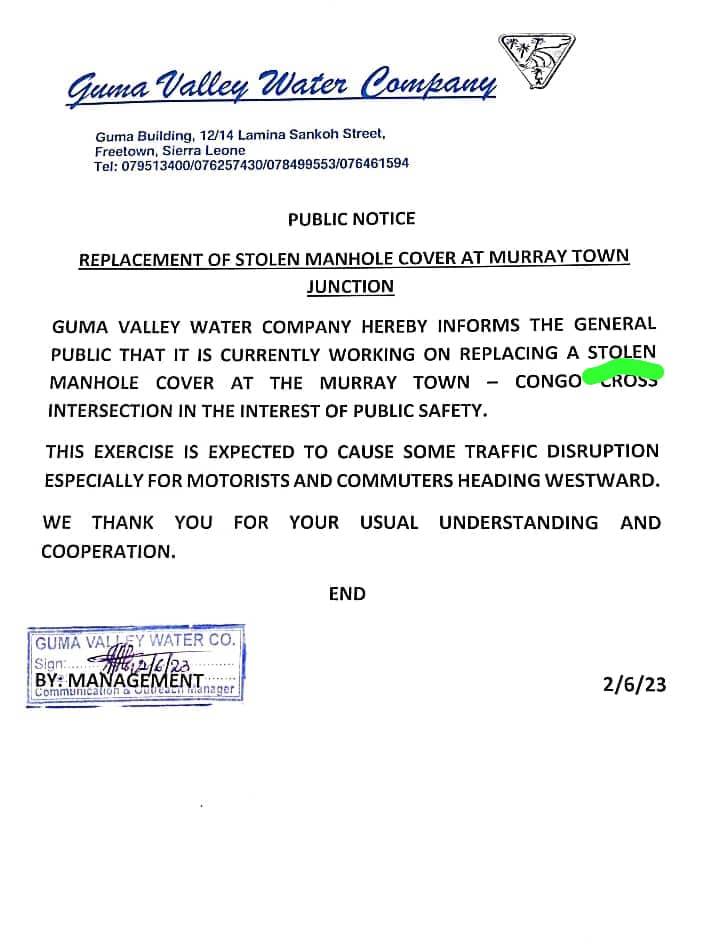 The notice stated that the company is currently working on replacing a stolen manhole cover at the Murray Town Congo Cross intersection in the interest of public safety.