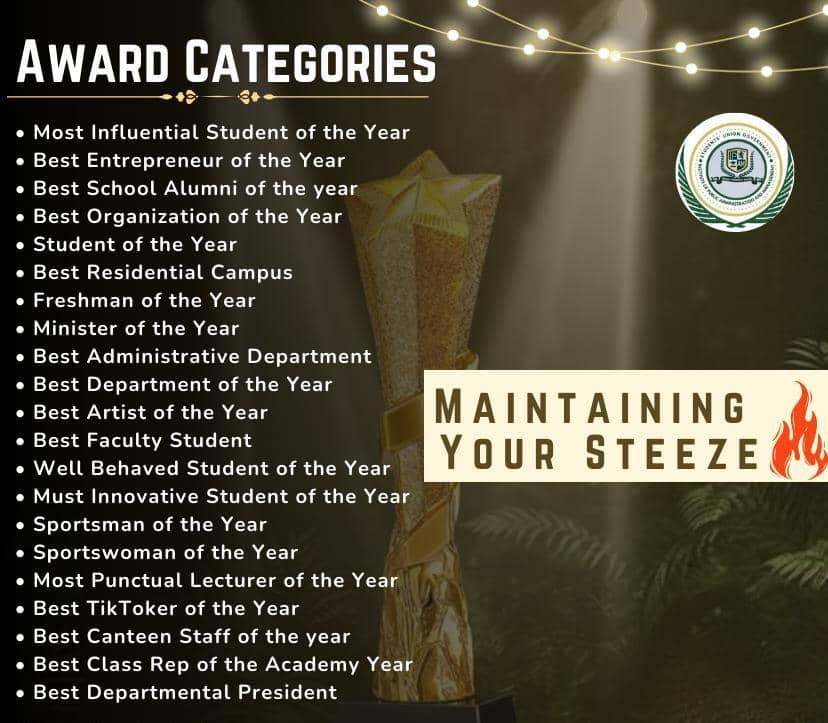 Most Influential Student of the Year, Best Entrepreneur of the Year, Best Department of the Year, and even fun categories like Best TikToker of the Year and Best Canteen Staff of the Year.