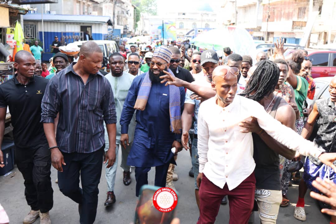 On February 9, 2026, Jagaban visited the devastated ECOWAS Street market in Freetown, where a fire outbreak left traders counting heavy losses. Moving through the charred remains of stalls and shops, he spoke with affected business owners and assessed the scale of destruction firsthand. His presence attracted large crowds of residents and youths, many of whom gathered to express appreciation for the visit.