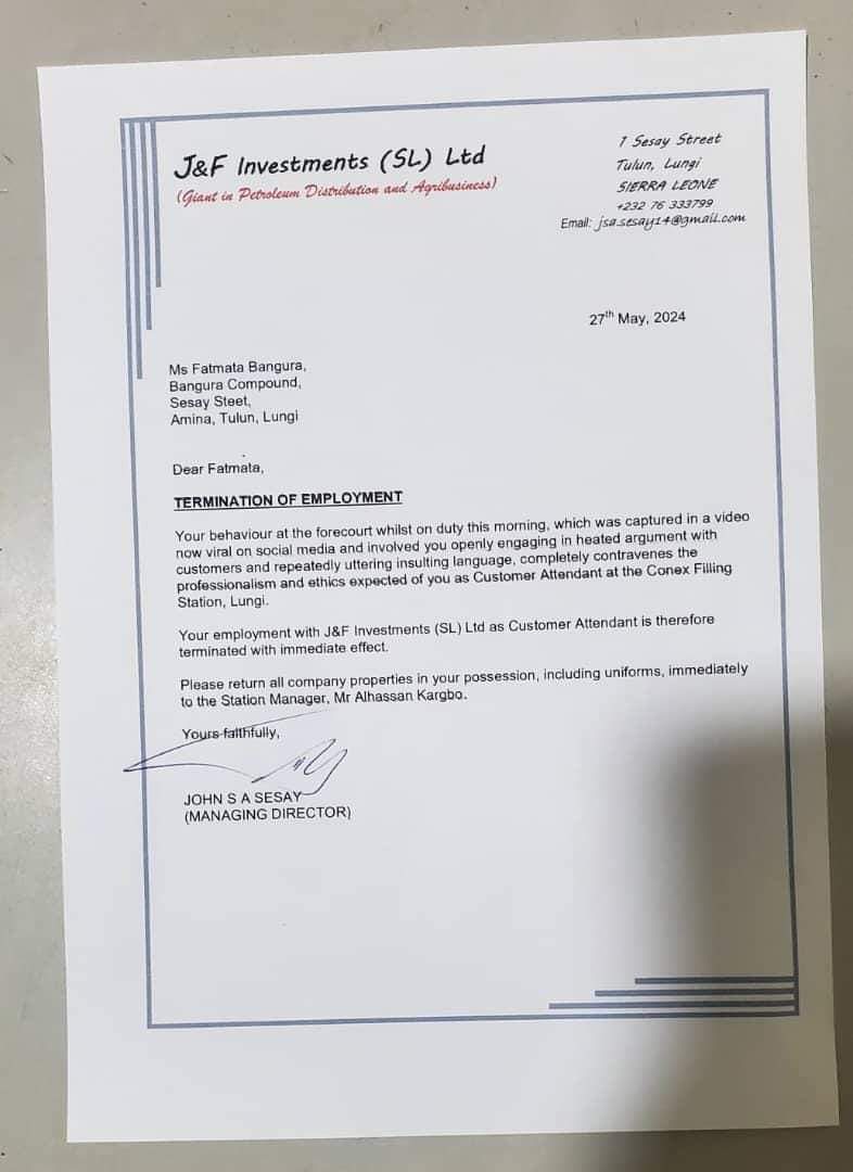 J&F Investments SL Ltd has terminated the employment of Fatmata Bangura, an employee attached to the Conex Filling Station in Lungi.