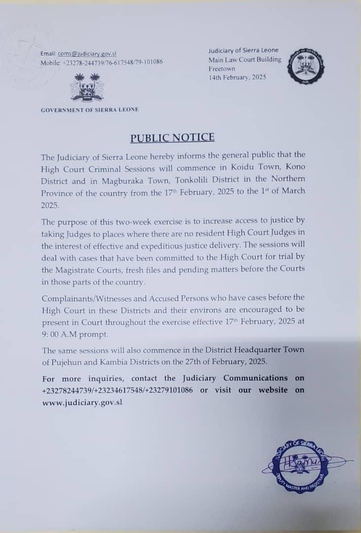 The Judiciary of Sierra Leone has announced that High Court Criminal Sessions will be held in Koidu Town, Kono District, and Magburaka Town, Tonkolili District, in the Northern Province from February 17 to March 1, 2025.