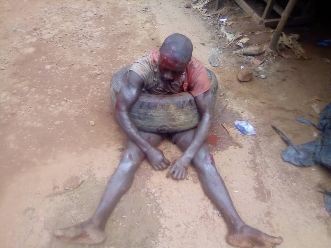 According to the pictures we can see that he was beaten mercilessly and blood was oozing from his head. The accused might have been beaten to the point of been burnt, as we can see on the pictures, he is lying on the floor helplessly and on the other part of the picture, he is put to sit down with a tire been hanged over his body.