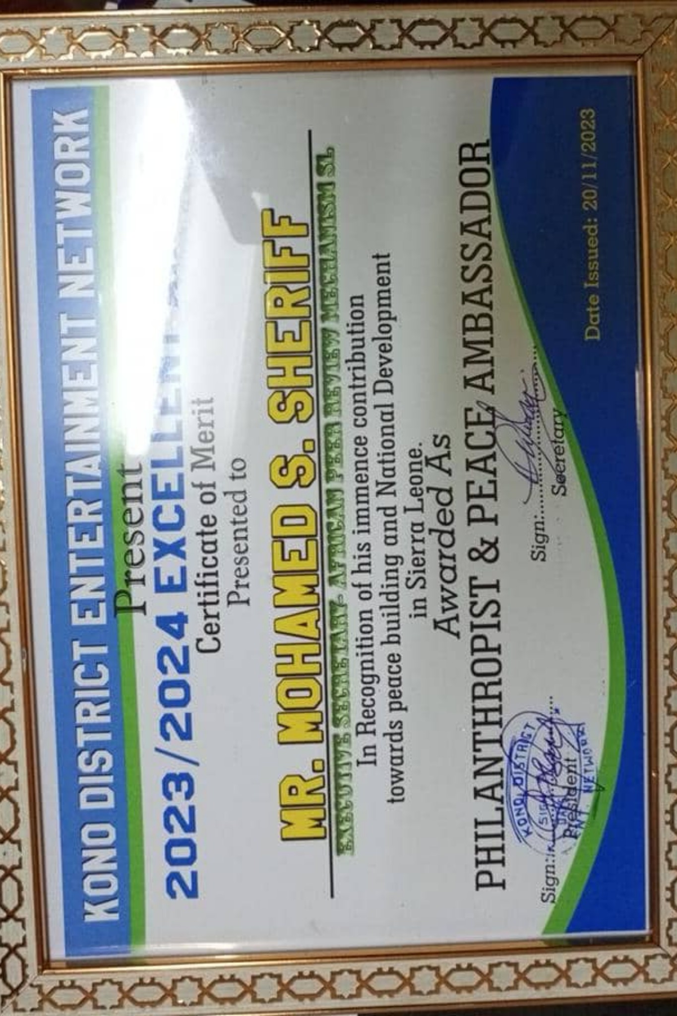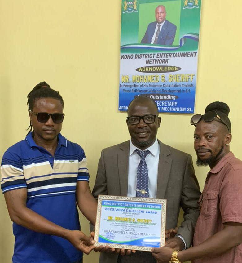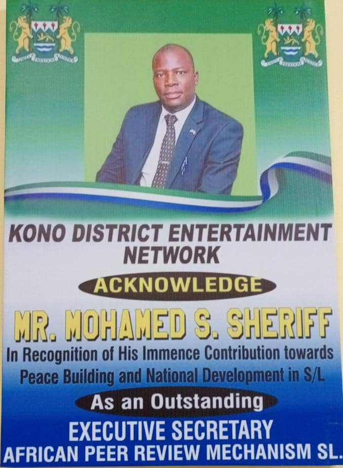The Kono District Entertainment Network proudly acknowledges Mr. Mohamed S. Sheriff, the Executive Secretary of the African Peer Review Mechanism (APRM), for his exceptional contributions to peace-building and national development in Sierra Leone. He has been honored as a Philanthropist and Peace Ambassador for his outstanding work in the country.