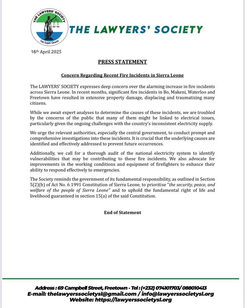 The Lawyers’ Society has called on the government to carry out a full audit of the national electricity system following a series of fire incidents in Bo, Makeni, Waterloo, and Freetown in recent months.