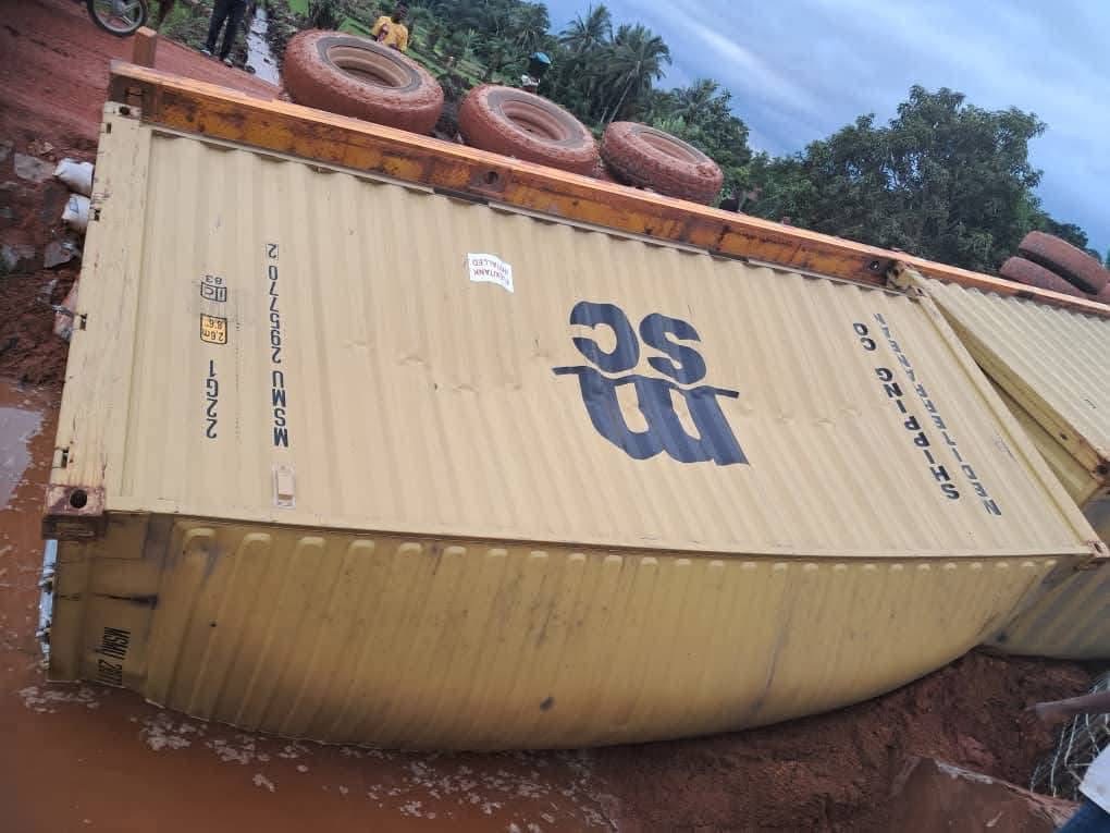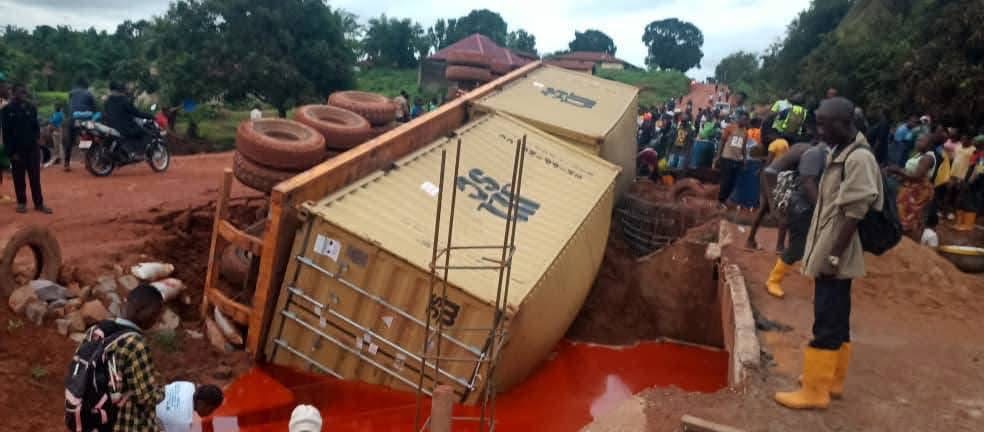 As the tankers maneuvered through the muddy and uneven bypass, they lost balance, leading to one vehicle overturning completely. This resulted in a punctured tank and the spillage of dozens of oil drums, with losses estimated in the millions of leones.