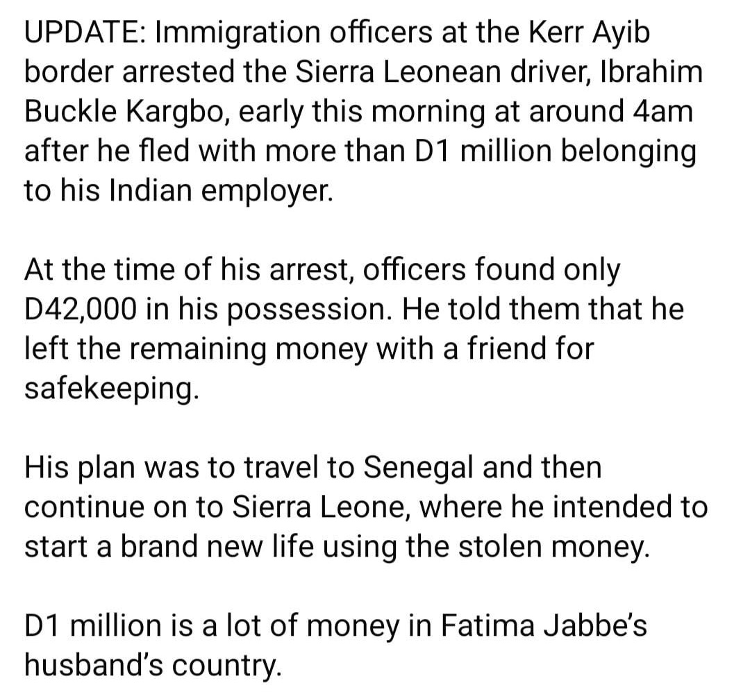 Immigration officers at the Kerr Ayib border post arrested the suspect, identified as Ibrahim Buckle Kargbo, in the early hours of the morning at around 4 a.m. The arrest followed reports that Kargbo, who worked as a driver, had absconded with a large sum of money belonging to his Indian employer.