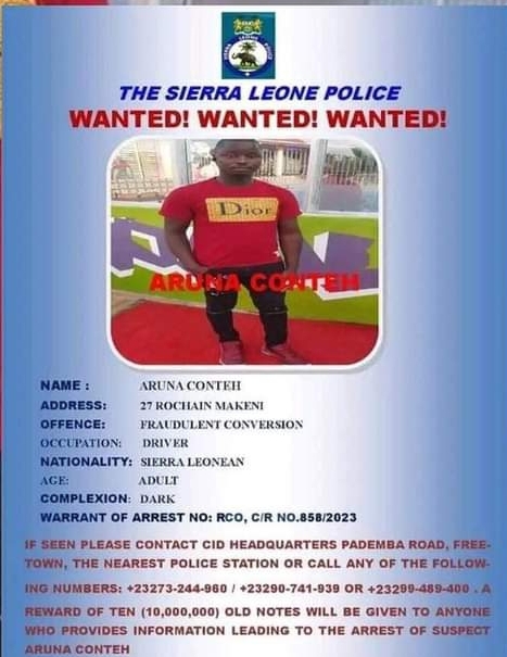 Despite extensive efforts, Aruna Conteh has not been apprehended. If you possess any information that could lead to his arrest, please contact any of the ACD numbers mentioned on the flyer. A reward of Le10,000,000 awaits the informant.