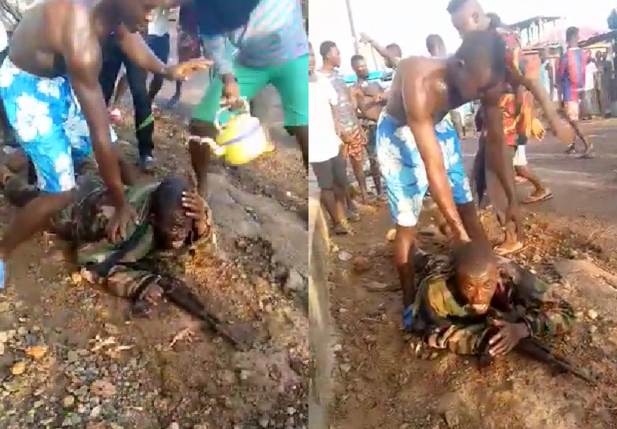 The officer was seen tortured in the video and fully dressed with military uniform and a gun on his possession. Residents said he was caught stealing in their house. Angry youths came with water and splashed it on his face while others were busy sending heavy objects on him.