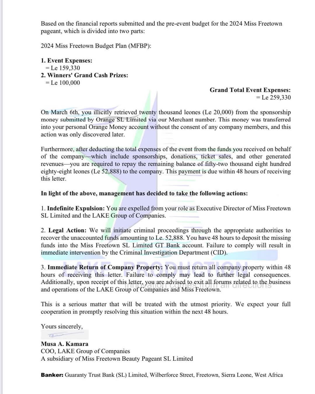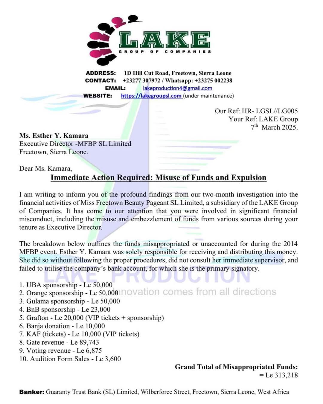 A separate letter from the LAKE Group of Companies, dated March 7, 2025, provided a more extensive breakdown of the alleged financial irregularities during the 2024 Miss Freetown Beauty Pageant. The company disclosed that Kamara was solely responsible for receiving and distributing sponsorship money but failed to follow due procedures and did not consult her immediate supervisor before handling the funds.