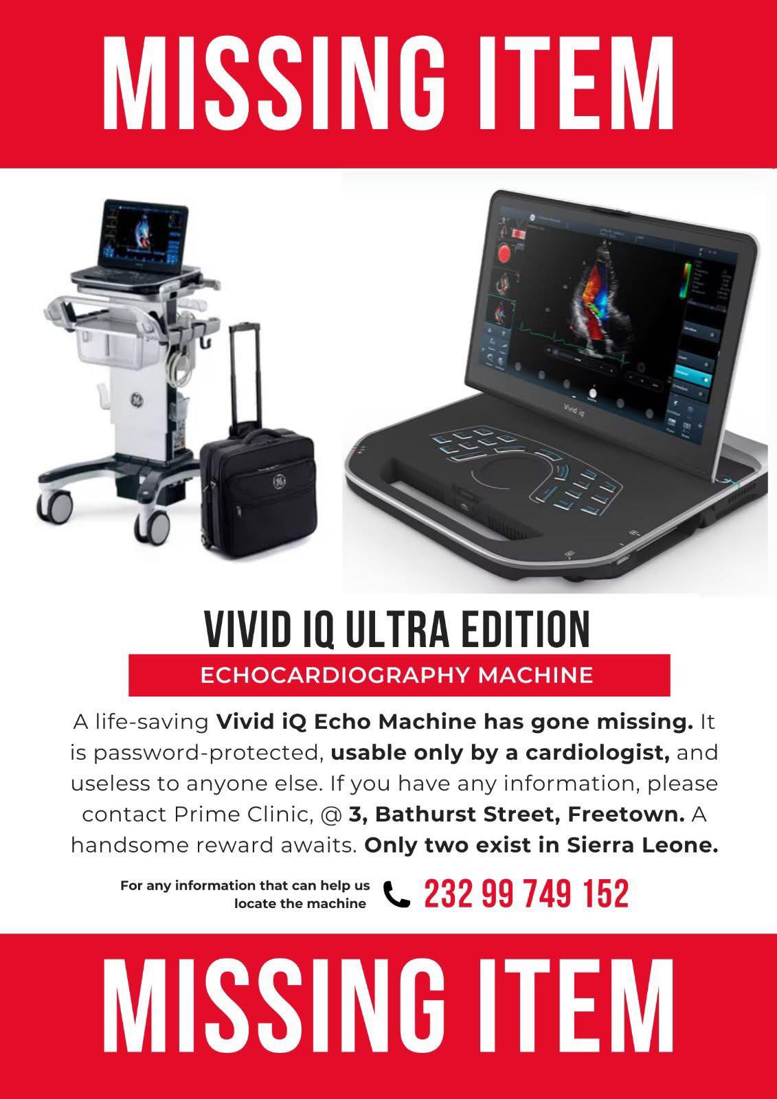 A public appeal has been launched for the recovery of a missing echocardiography machine—one of only two such devices in Sierra Leone.