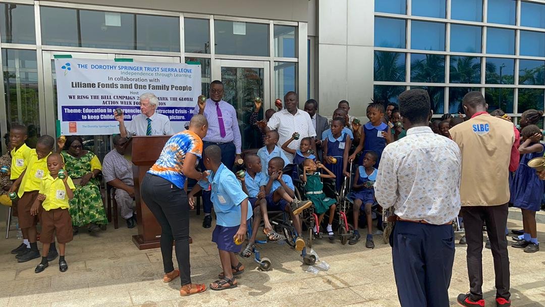 The former British High Commissioner to Sierra Leone, HE Paramount Chief Kombrabai Peter Penfold,  instruct the children, teachers and dignitaries present to start ‘ringing the bell’ to raise awareness of inclusion and accessibility in education for children living with disabilities.