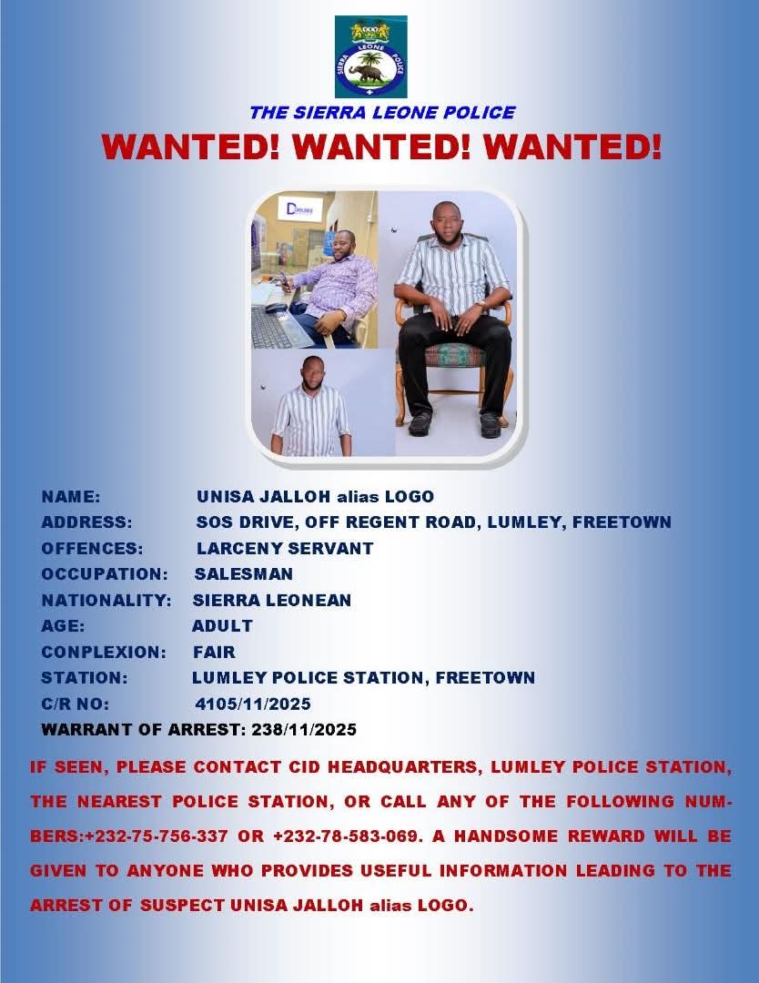 The Sierra Leone Police (SLP) has issued a search for a man identified as Unisa Jalloh, also known by his alias “Logo,” who is wanted in connection with an alleged crime of Larceny by Servant.