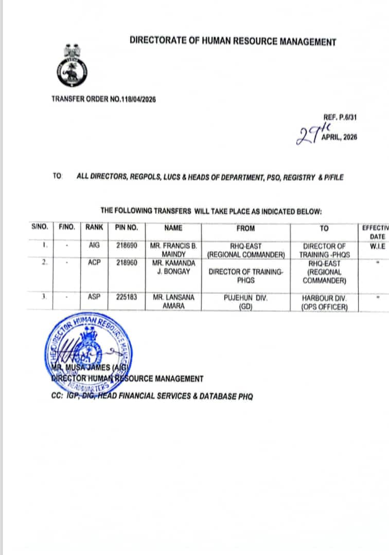 According to a formal transfer order referenced P.6/31 and dated 27 April 2026, the changes were approved and signed by Mr. Musa James (AIG), Director of Human Resource Management.
