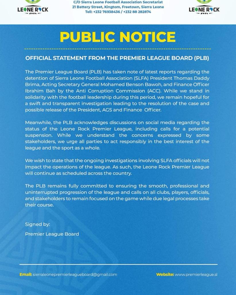 The Premier League Board (PLB) has issued an official statement addressing recent developments involving the Sierra Leone Football Association (SLFA), following the detention of SLFA President Thomas Daddy Brima, Acting Secretary General Mohamed Benson Bawoh, and Finance Officer Ibrahim Bah by the Anti-Corruption Commission (ACC).