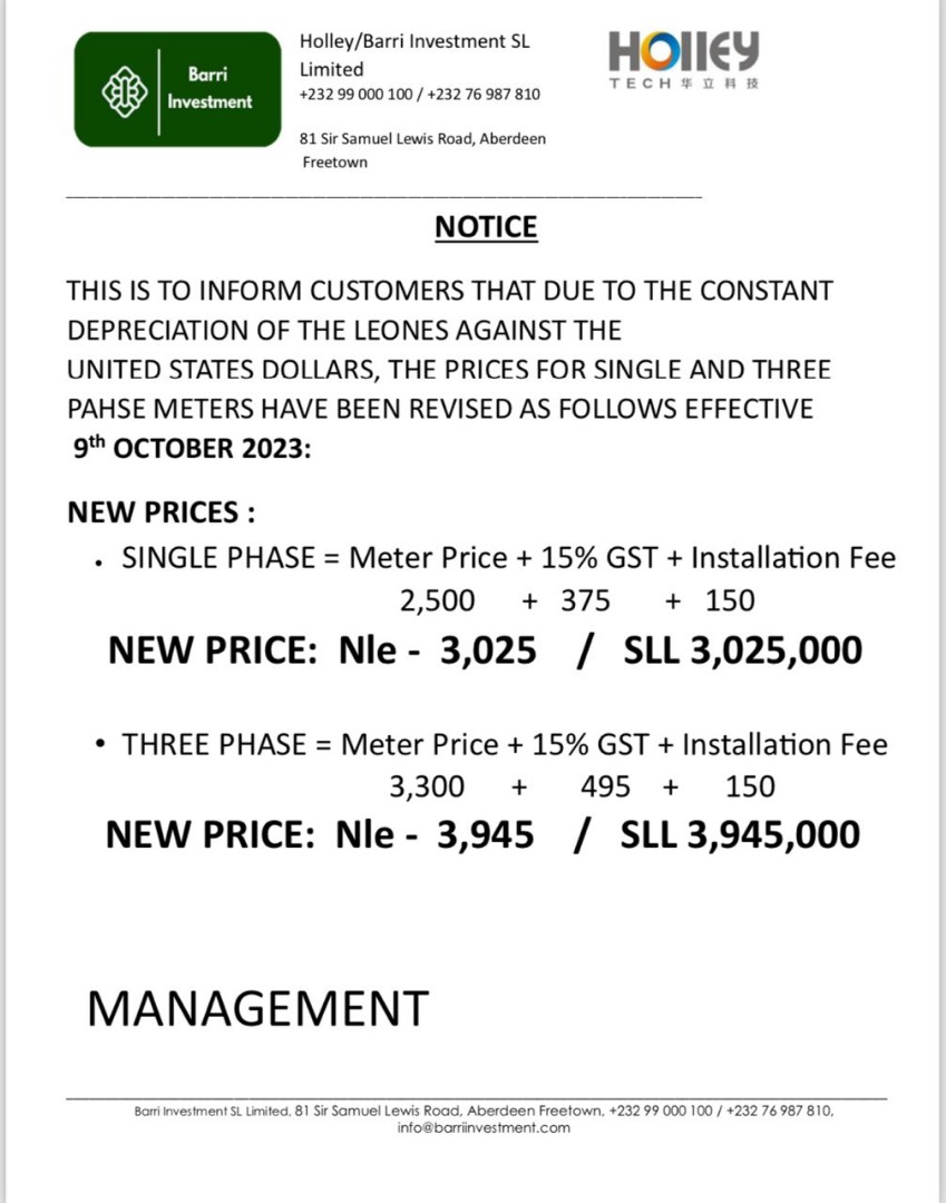 Barri Investment SL Limited at Aberdeen, Freetown, has increased the prices of their various electrical Meters in store.