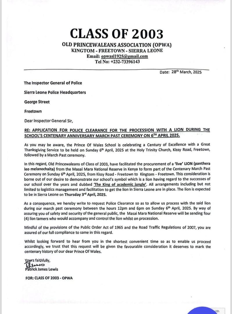 The Class of 2003 from the Prince of Wales School in Freetown has made an official request for police clearance to include a live lion in their centenary anniversary March Past ceremony.