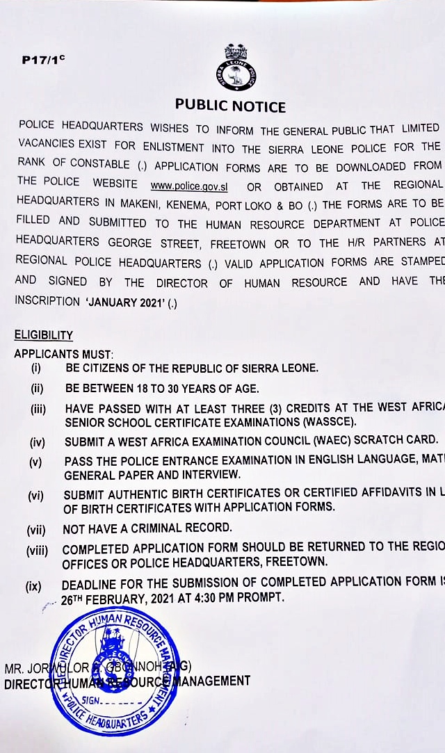 In a public notice obtained by Sierraloaded, AIG Jorwulor Gbonnoh, the Police Director for Human Resource Management said the security agency is recruiting qualified persons as constables from January to February, 2021.