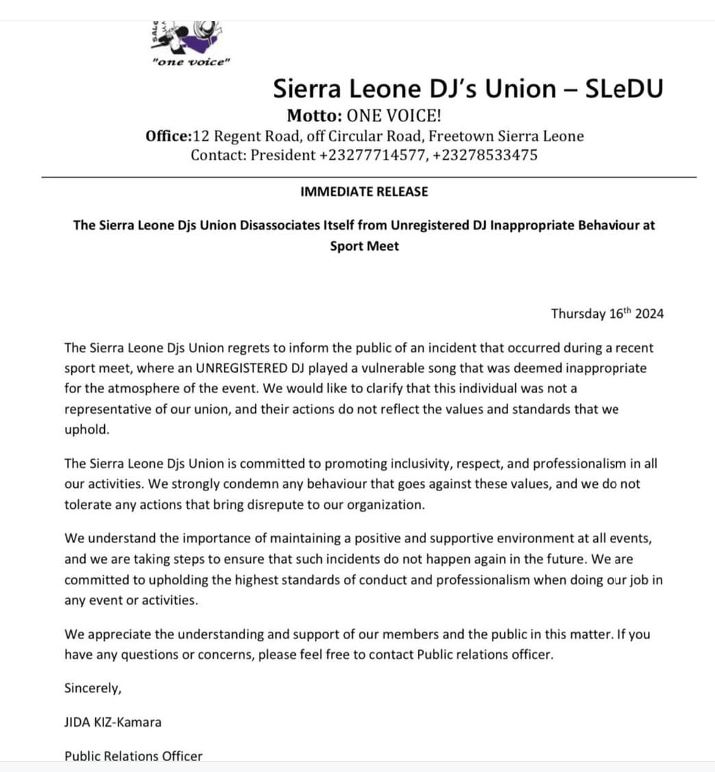 The Sierra Leone DJs Union (SLDU) has issued a statement regarding an incident that occurred during a recent primary School sports meet. According to the press release, an unregistered DJ played a song that was deemed inappropriate for the event’s atmosphere.