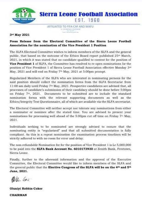 The Sierra Leone Football Association (SLFA) has in a press release dated May 3, 2021, postponed the Elective Congress which was to take place from February 2021 to June 2021.