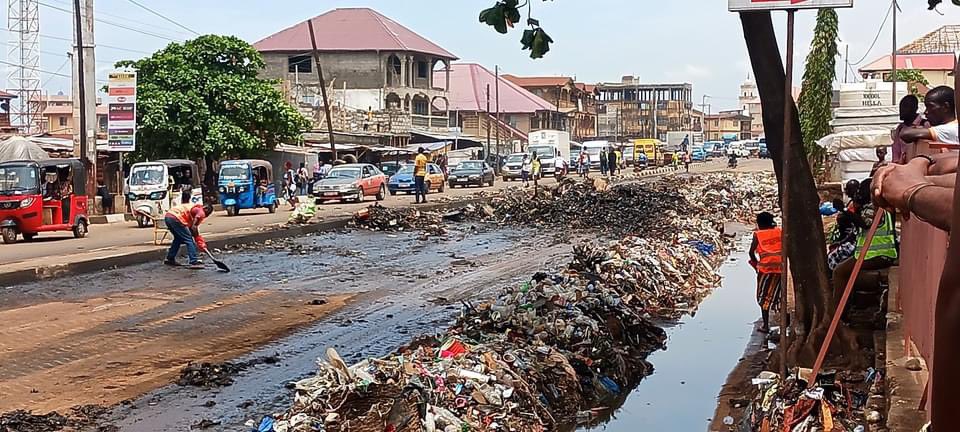 In a collaborative effort, the Sierra Leone Roads Authority (SLRA), alongside Gento Group of Companies and Pavi Fort – AL Associates, swiftly responded to clear a significant buildup of trash that inundated and obstructed the main road at Brima Lane New Road following a period of intense rainfall.