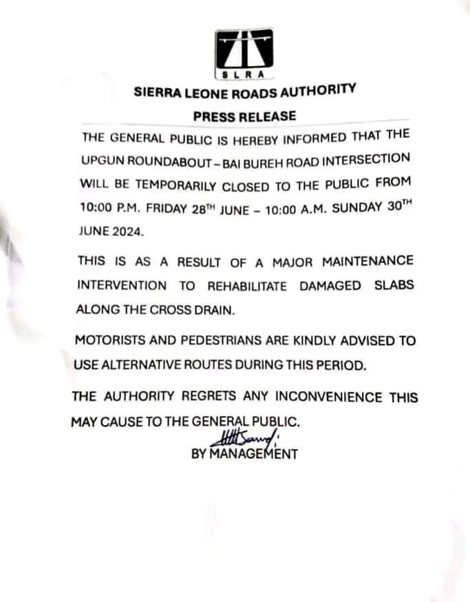 The Sierra Leone Roads Authority (SLRA) has announced the temporary closure of the Upgun Roundabout-Bai Bureh Road intersection. The closure is scheduled to take place from 10:00 p.m. on Friday, June 28th, until 10:00 a.m. on Sunday, June 30th, 2024.