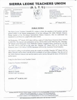 SLTU states that they wish to draw the attention of all teachers and the general public to the funeral arrangements of their late colleague Mr. Gillis Olarinde Johnson, a former teacher at the Providence International School Freetown, who they understand was murdered in cold blood by a pupil of the same school.