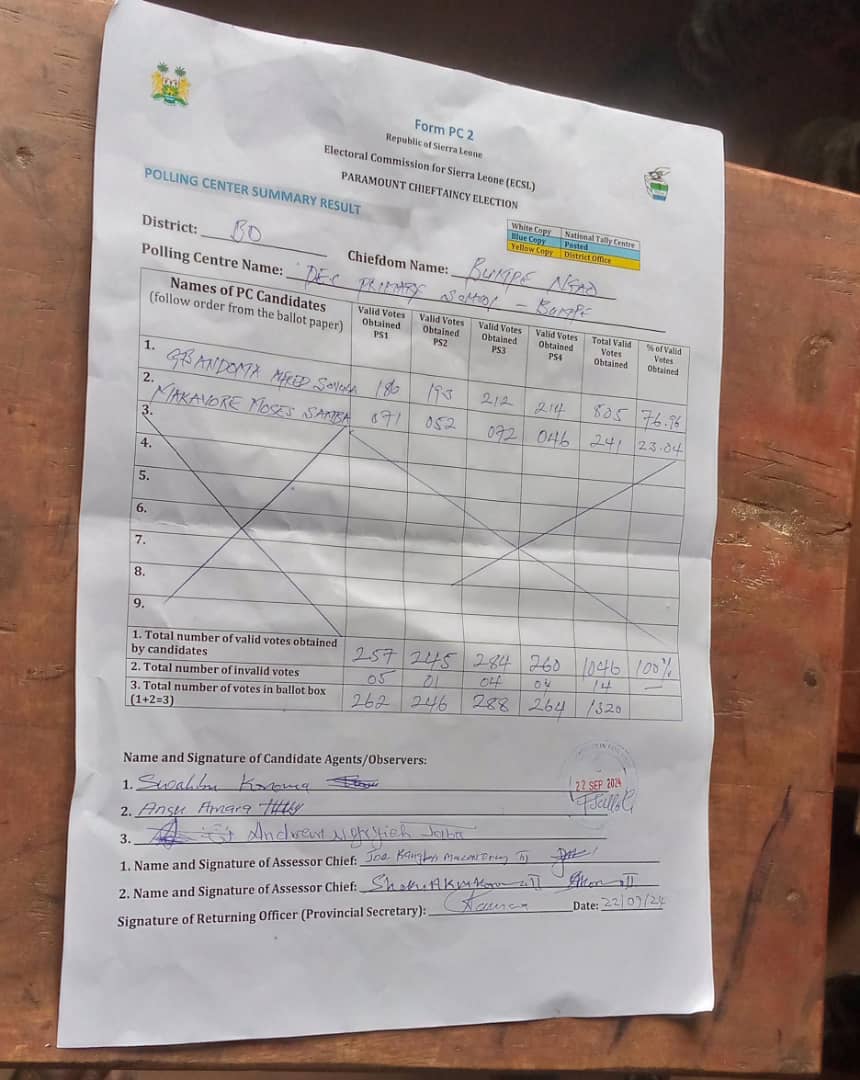 According to results announced by the Electoral Commision for Sierra Leone (ECSL), Sovula secured 77% of the vote, with 805 votes cast in his favor, defeating his opponent, Makavore Moses Samba, who garnered 241 votes, representing 23.04%.