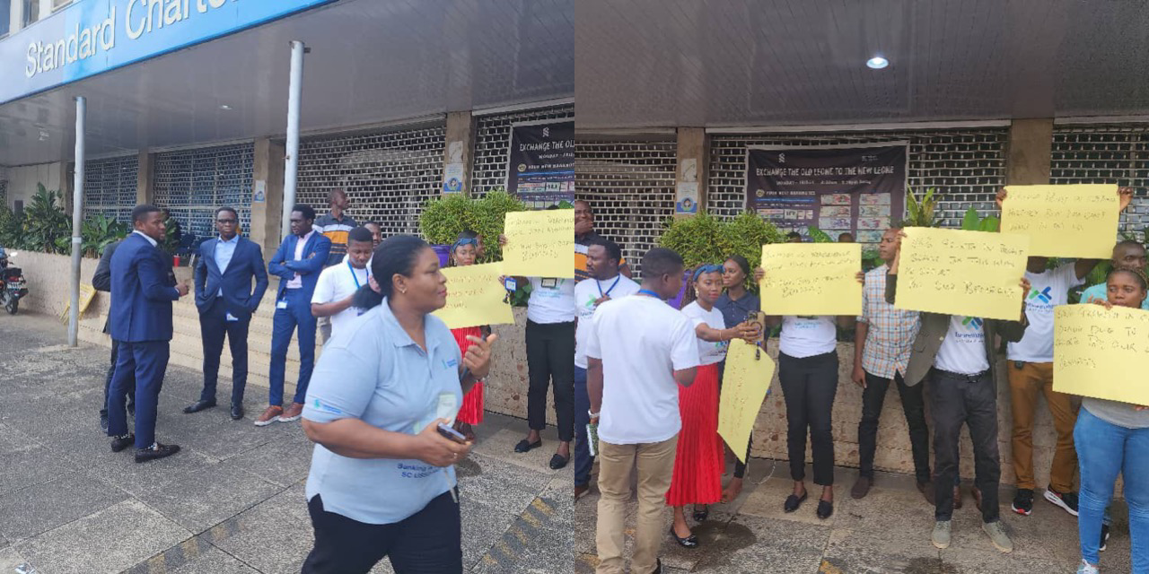 Employees of Standard Chartered Bank gathered outside the bank’s headquarters on Thursday in Freetown, Sierra Leone to stage a protest, demanding their long-awaited terminal benefits.